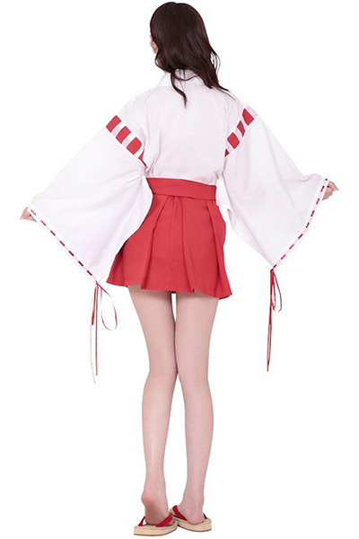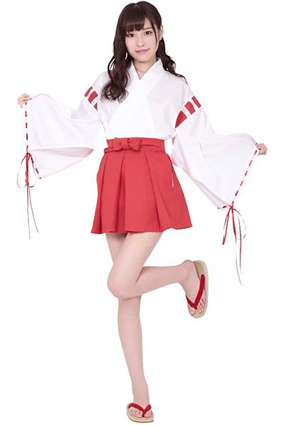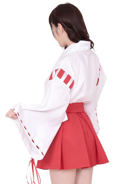 袴風ミニ丈スカートが可愛い!あの大人気コスプレ「夢のなかの巫女ちゃま」に大きめサイズが登場♪白い着物に赤のパイピングが印象的な和装コスプレ。ハロウィン、忘年会や年末年始など、季節ごとのイベントに是非どうぞ!