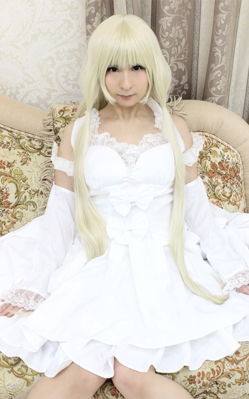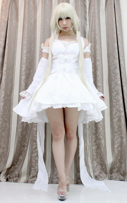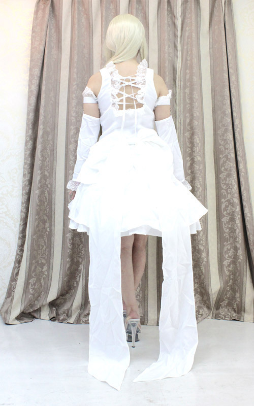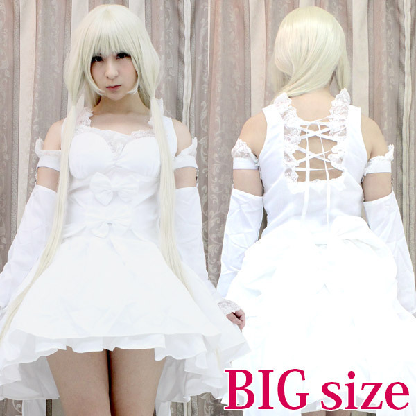 清楚でキュート!大きめサイズ、ロマンティックな純白ドレスのアニメコスプレ。 レース&リボンがたっぷり!後姿がセクシーなトップスに、フリルスカート、ワイヤー入りパニエ、引き裾風の大きなウエストリボン、愛らしい2種類のアームカバーがセットになった、ラブリーなコスチュームセットです。