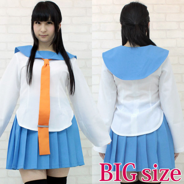 あのコの同級生になれる?水色と白のコントラストが爽やかな長袖制服コスチューム(BIG)。 オレンジ色のホック式ネクタイは、一段と目を引くロングサイズ!ブラウス裾のループに通せば邪魔になりません。 男性でも着用できる大きめサイズの制服コスプレ衣装です。