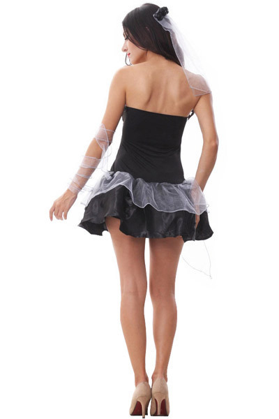 ゾンビメイクでミイラな花嫁に♪ハロウィンにぴったりなゾンビ系ウェディングドレスコスチューム。ダークなブラックカラーのベアトップワンピースに巻いたオーガンジーリボンでミイラの包帯をイメージ!腕にぐるりと巻きつけられるよう、単品リボンもセット。サテン素材のふんわりミニスカートで可愛らしさもしっかり備えたハロウィンコスプレ衣装です。※セット内容以外は付属しておりません。