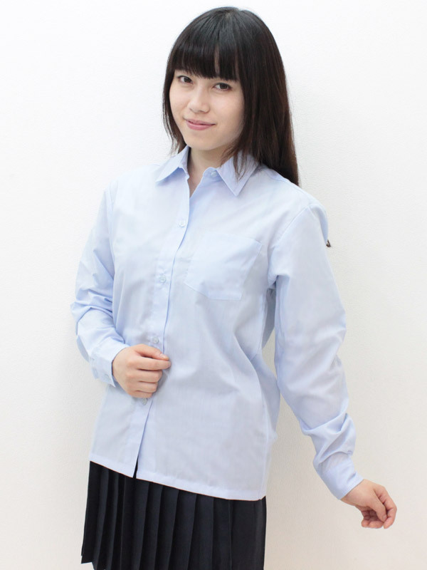 白シャツとは異なる魅力!パリッと着こなしたいサックスカラーの長袖シャツ単品。手持ちの制服コスチュームを、これ1つでマイナーチェンジ!このポケットつきのトップスは、ストレート裾なのでスカートの上に出して着用しても似合います。※水洗い不可、塩素系漂白剤による漂白不可、アイロンは中温で当て布使用、ドライクリーニング可。