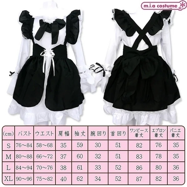 Mサイズ:B80〜88cm・W66〜72cm・肩幅37cm・袖丈60cm・腕周り32cm・首周り51cm・着丈(ワンピース83cm、エプロン78cm、パニエ約35cm)・帽子頭周り55cm セット内容:胸リボン付きワンピース、編み上げリボン付きエプロン、パニエ、コサージュ、カチューシャ、帽子