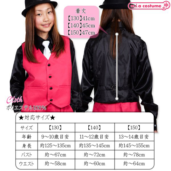 150サイズ 対応サイズ:身長145〜155cm・B〜78cm・W〜64cm 実寸:着丈47cm セット内容:ベスト単品(前ボタン) 素材:ポリエステル100%