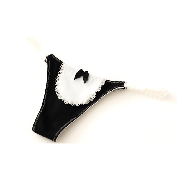 日本国内の工場で縫製された、伸縮性のある肌触りの良いマイクロファイバー生地を使ったメイドスタイルのTバックショーツです。 小さなリボンとエプロンやレースをあつらえた、キュートでセクシーなメイド風デザインのショーツです。